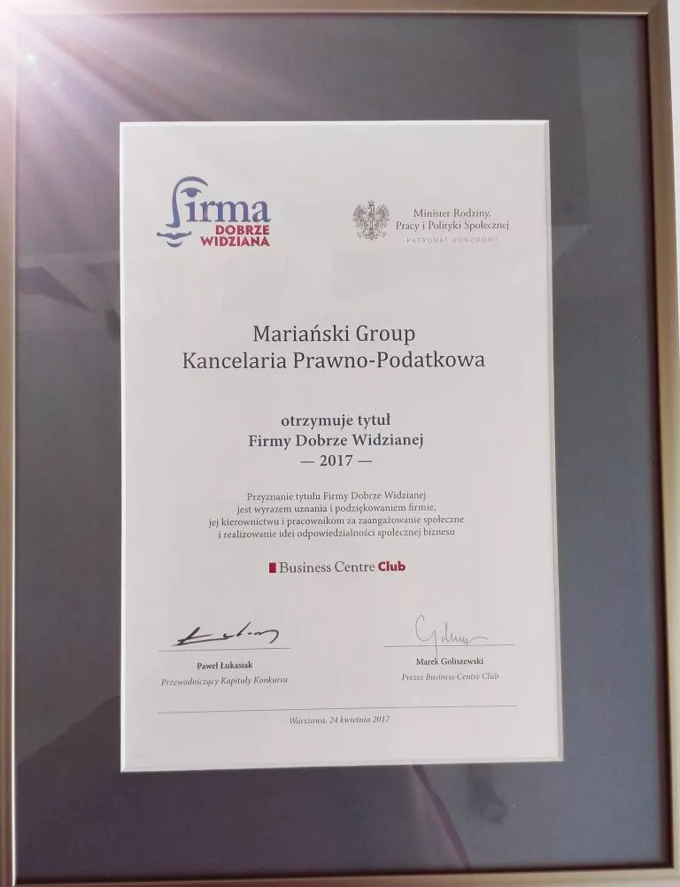Mariański Group Kancelaria Prawno-Podatkowa została nagrodzona tytułem “Firma Dobrze Widziana 2017” za prowadzenie społecznie odpowiedzialnego biznesu (CSR).