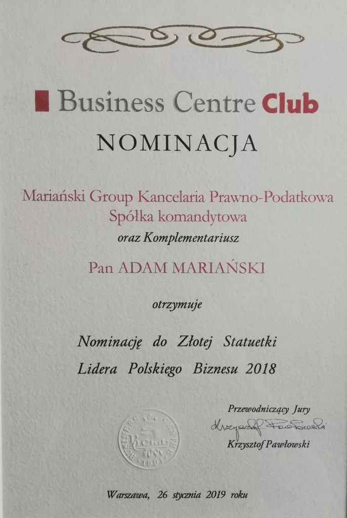 16 maja br. prof. dr Adam Mariański otrzymał Nominację do Złotej Statuetki Lidera Polskiego Biznesu.